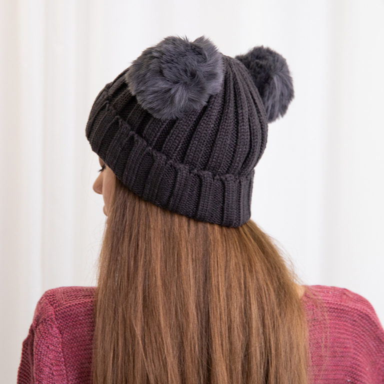 • Pălărie minunată de iarnă din material plăcut la atingere. Decorat cu două pompe pufoase pe laterale. Perfect pentru zilele reci și de iarnă!
