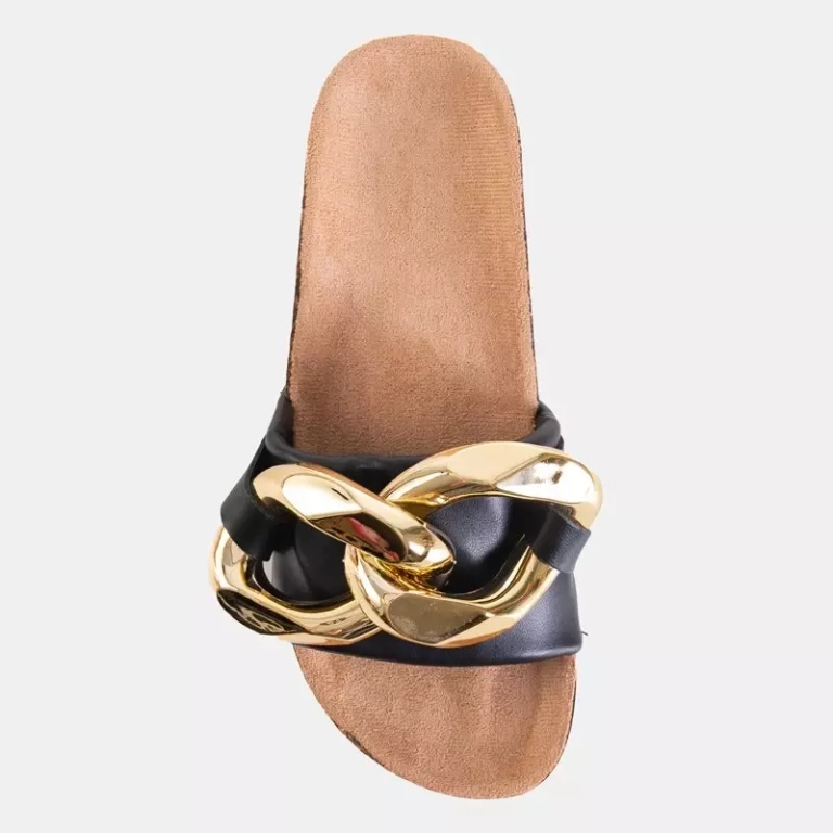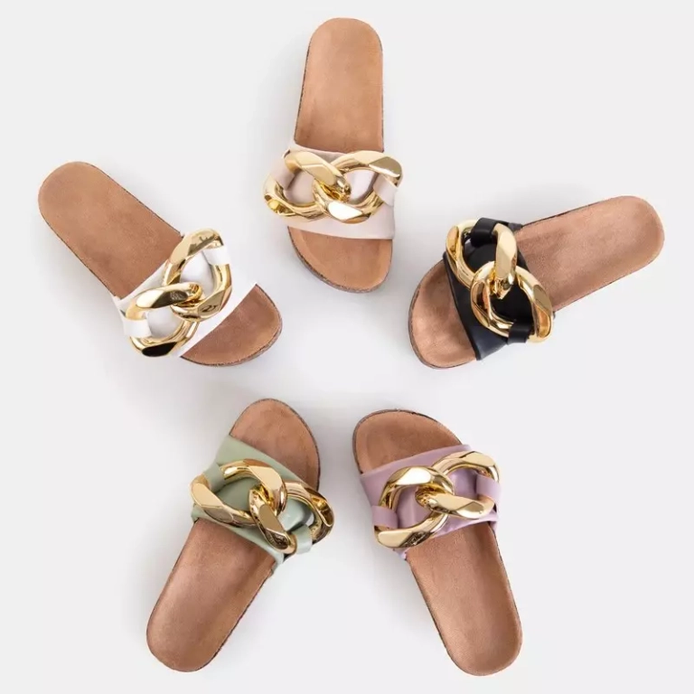 - Papuci de dama fantastici decorati cu un lant mare de aur. Cureaua este din piele ecologică, branțul este din piele ecologică. Perfect pentru a crea ținute de vară la modă! Notă: produsul are urme de adeziv pe material.