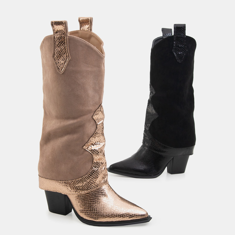 Cizme negre cu partea superioară decorată a'la piele de șarpe Wica- Încălțăminte