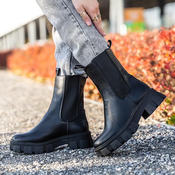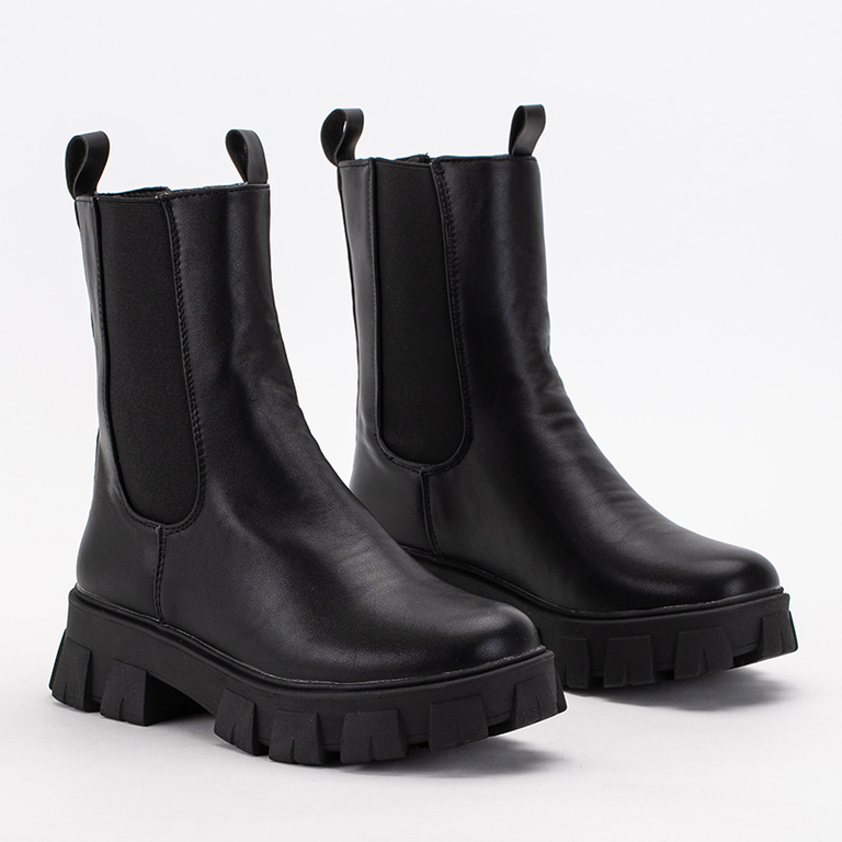 - Cizme de lucru negre cu talpa groasa. Modelul este confectionat din piele ecologica, brant din material textil. Pantofii au inserții elastice pe părțile laterale ale căptușelii.