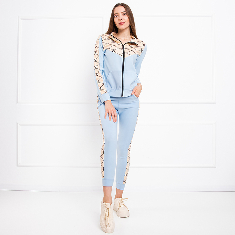 - Set sport pentru femei, cu pantaloni de trening și hanorac. Modelul este realizat dintr-o țesătură plăcută la atingere. Partea superioară a setului cu imprimare pe față, fără glugă, partea inferioară cu talie elastică și partea inferioară a picioarelor și