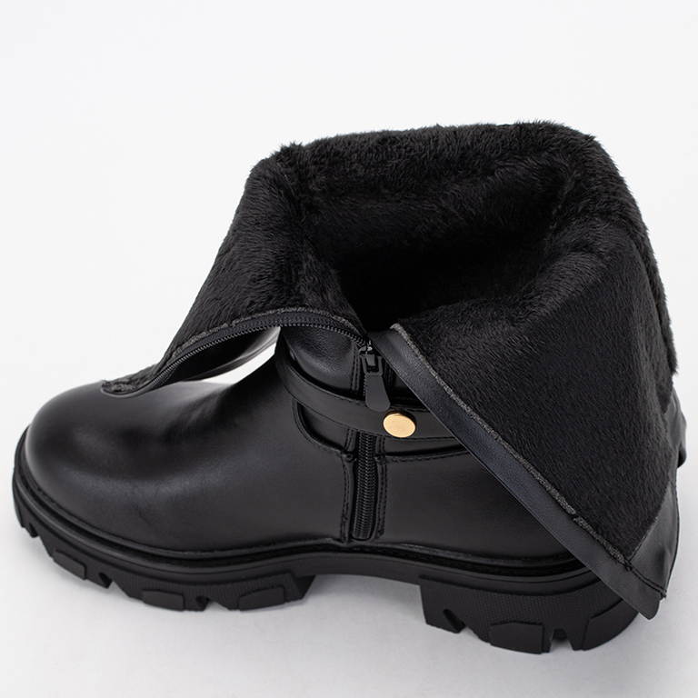- Cizme la modă pentru femei, din piele ecologică. La înălțimea gleznei, modelul este decorat cu o curea detașabilă cu un lanț din plastic de culoare aurie. Pantofii sunt fixați cu fermoar, încălzirea interioară sub formă de blană delicată.