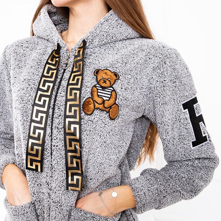 Hanorac gri de pluș, cu fermoar, cu petice ursuleț - Îmbrăcăminte