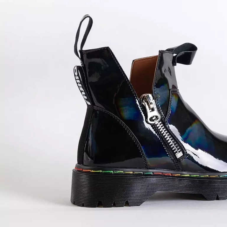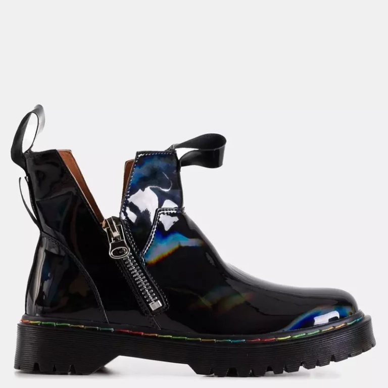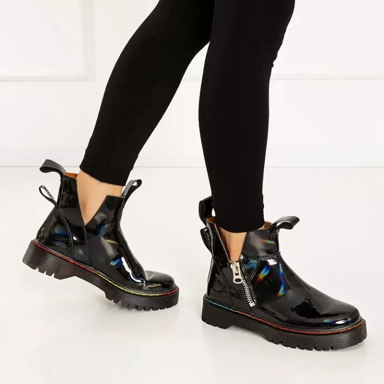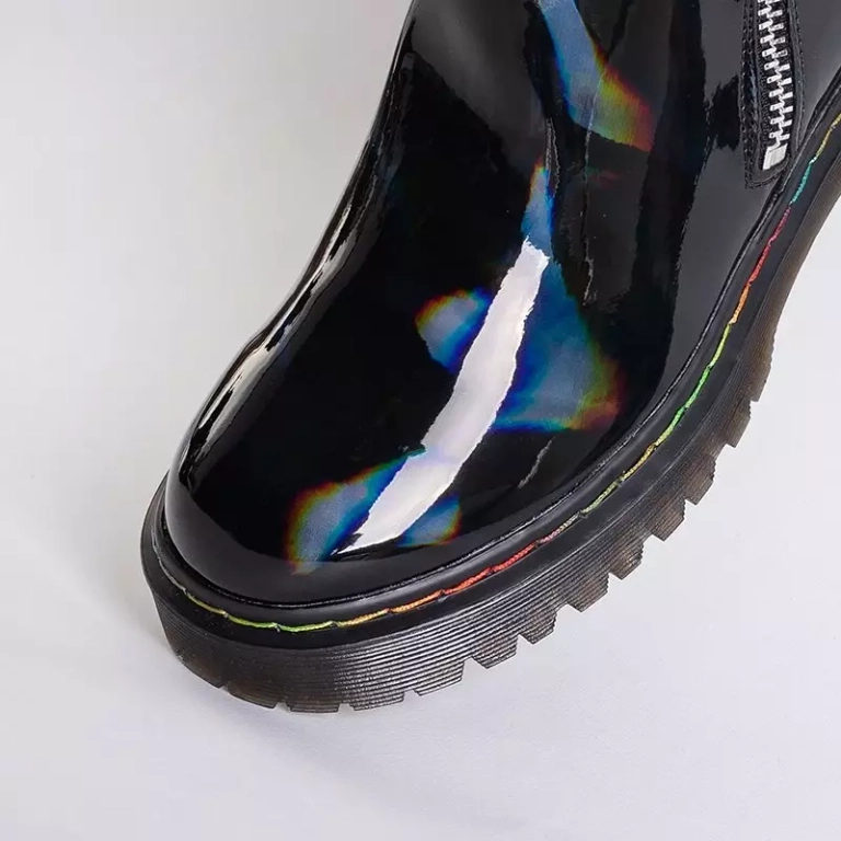 - Cizme de dama realizate dintr-o combinatie de material cauciuc si piele ecologica cu motiv olografic. Model fara izolatie, brantul in interior este captusit cu piele ecologica. Decupaje pe lateral si inchidere cu fermoar. Notă: produsul are material spart