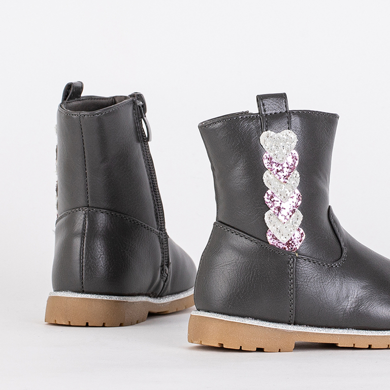 - Cizme pentru fete din piele ecologica. În interior, căptușită cu spumă subțire și material textil, cu fermoar la gleznă. Decorat cu inimioare cu sclipici! NOTĂ: modelul poate avea urme de lipici lângă talpă.