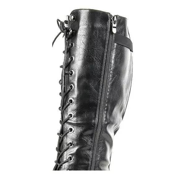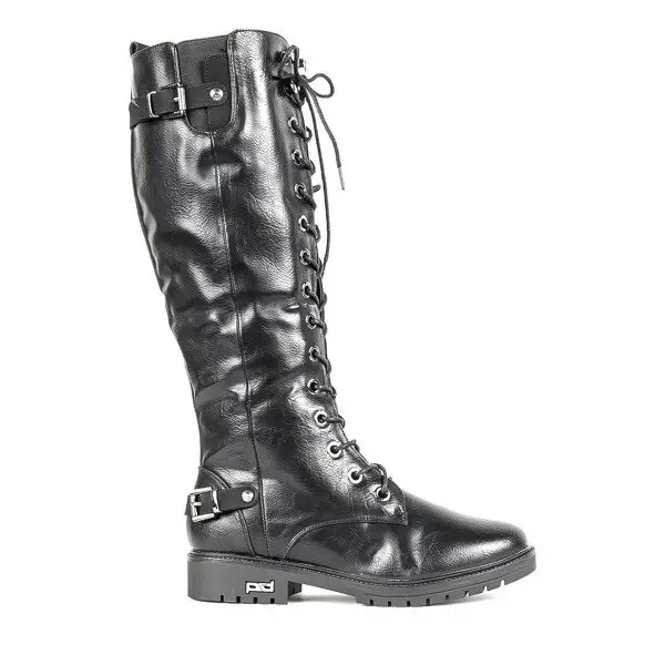 • Cizme cu toc plat din piele ecologica neagra. Interiorul încălțămintei este izolat cu o blană plăcută la atingere. Pantofii au fermoar și șireturi. Notă: produsul are zgârieturi pe material.