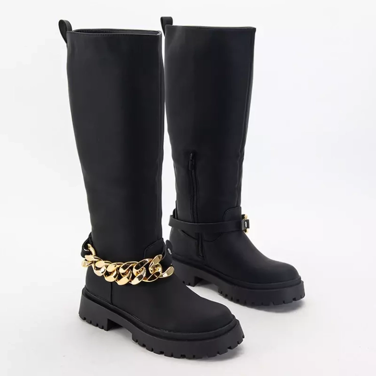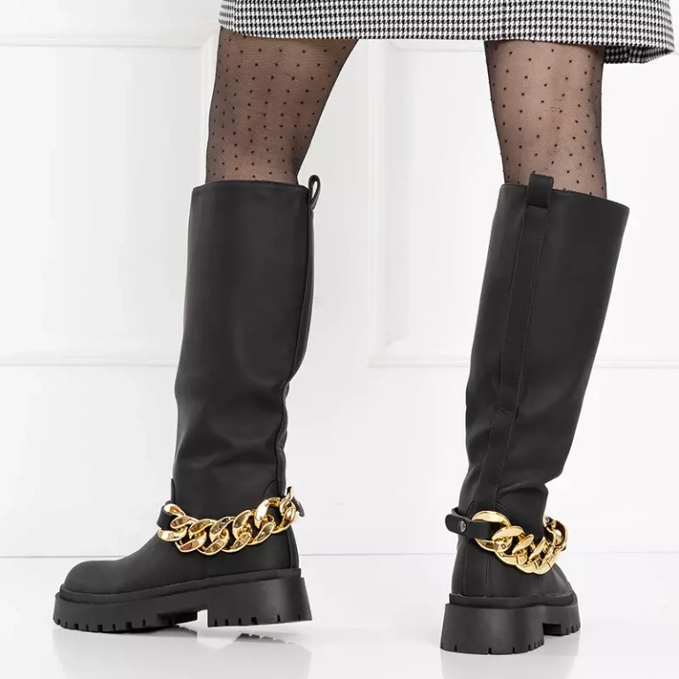 • Cizme de dama la jumatatea gambei din piele ecologica. Slip pe și parțial fermoar. Model cu toc plat cu un lant decorativ gros pe partea superioara. Notă: din produs lipsesc unele decorațiuni.