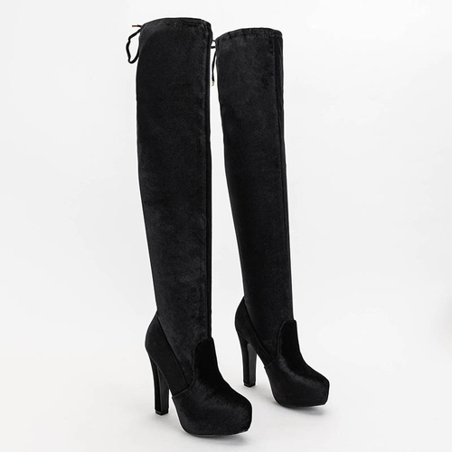 - Cizme cu toc înalt și cu platformă, elegante, peste genunchi. Partea superioară din velur, cu o cupă în vârf. Deget migdalat, incrustație de material. Perfect pentru ieșirile de seară la creații elegante!