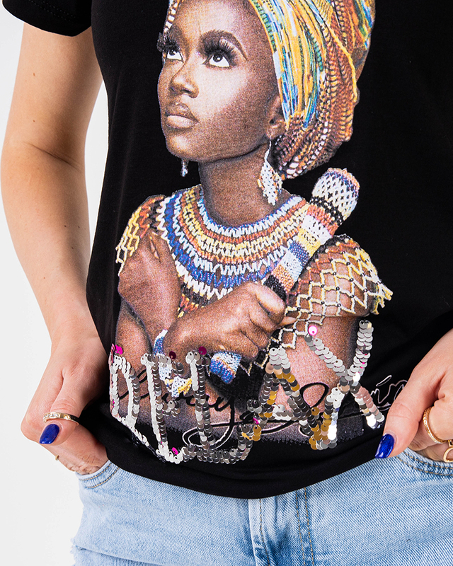 Tricou de dama negru cu imprimeu colorat si paiete - Imbracaminte