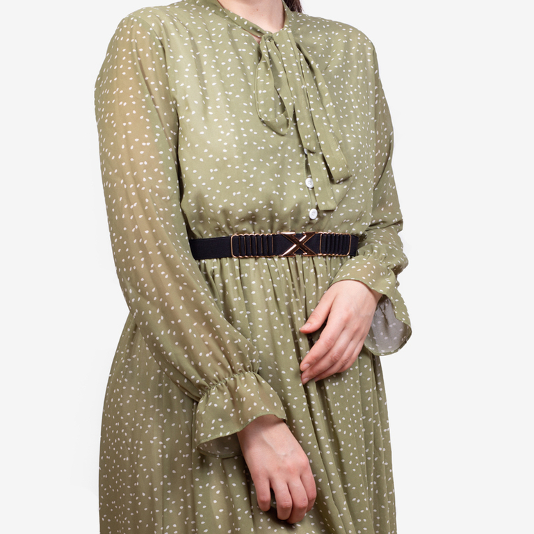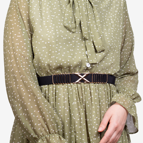 - O curea unică de damă cu ornament metalic, prinsă la spate cu un cârlig. Modelul este realizat dintr-o combinație de cauciuc elastic și metal. Subliniază perfect orice stil casual!