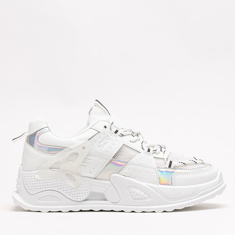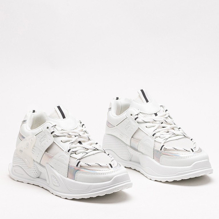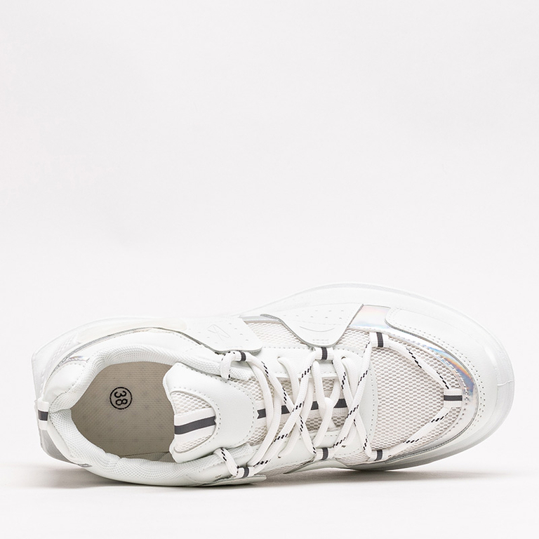 - Pantofi sport de damă la modă, confecționați dintr-o combinație de piele ecologică și țesătură, branț din material textil. Față cu șireturi cu inserții holografice, talpă din cauciuc.