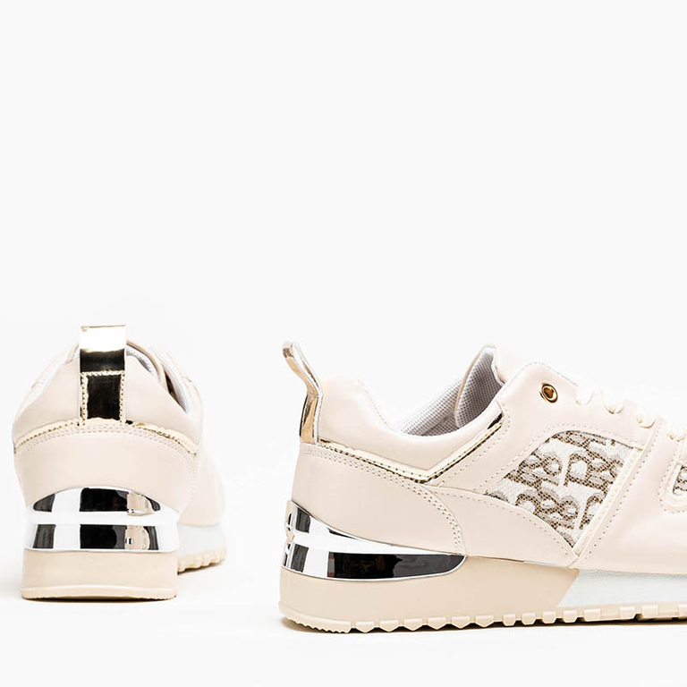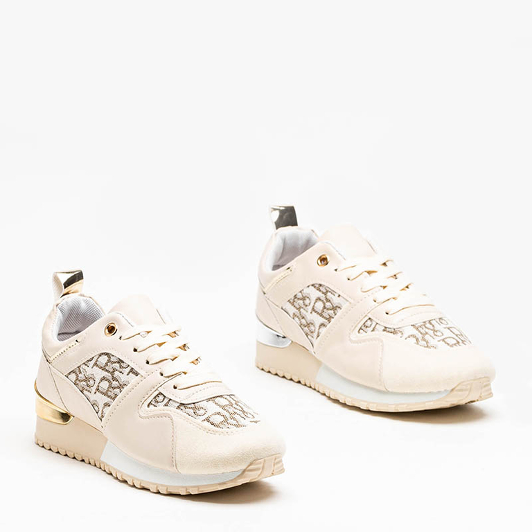 - Pantofi sport de damă bej din piele ecologică și țesătură. Față cu șireturi, decorată cu imprimeu și o inserție argintie pe spate. Căptușeala este din material textil. Pantofi perfecti pentru utilizarea de zi cu zi.