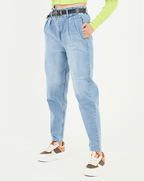- Blugi mom dama eleganti, din material bumbac. Modelul are: - talie inalta, - inchidere cu nasture si fermoar, - 4 buzunare, - centura lungime 100 cm si latime 3 cm NOTA: Precizia masuratorilor (+/-) 1 cm.
