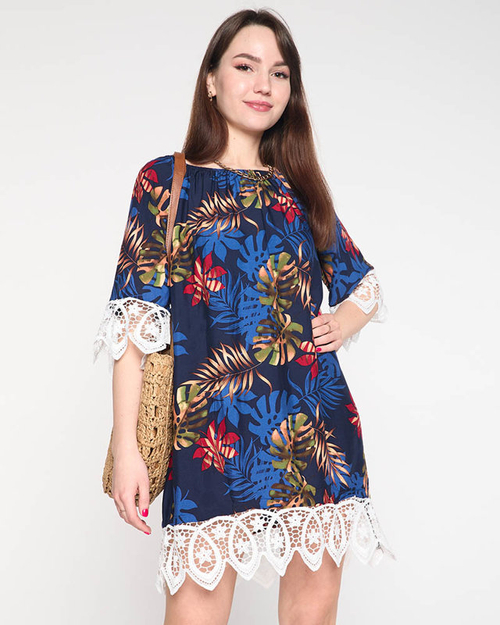 - Tunica dama cu maneca scurta si din material usor. Modelul este decorat cu un imprimeu de frunze, manecile si partea de jos a tunicii finisate cu dantela. O alegere genială pentru zilele caniculare! NOTĂ: Precizia măsurătorii (+/-) 1 cm.