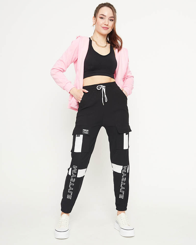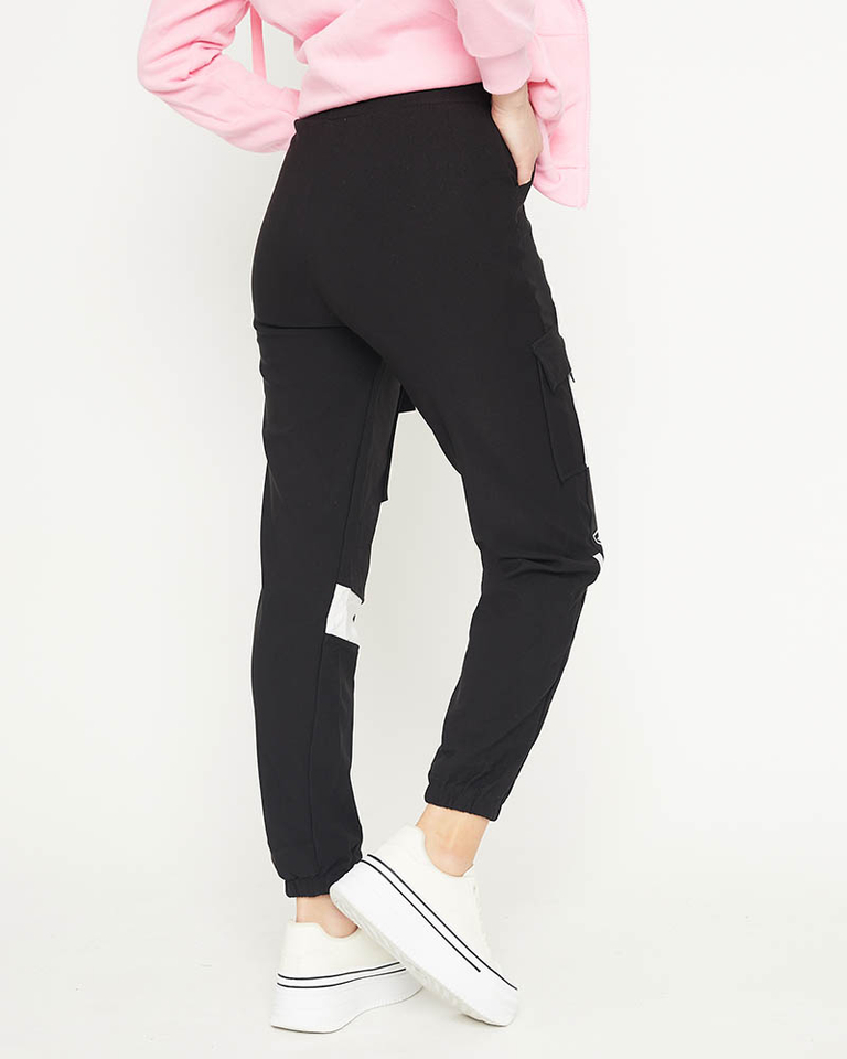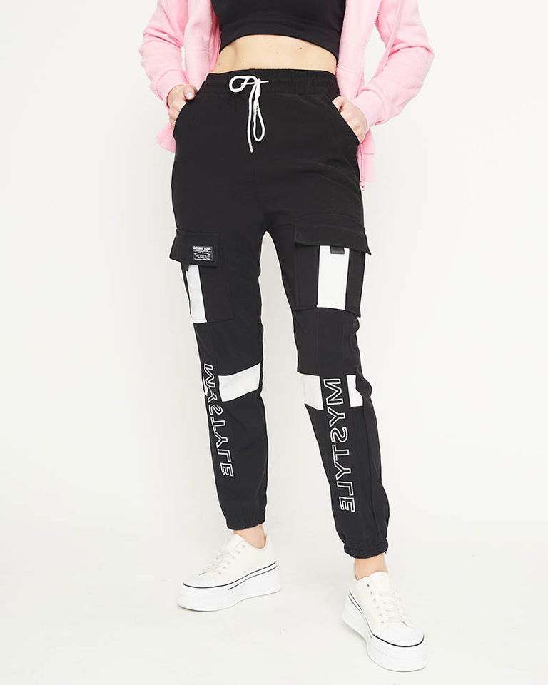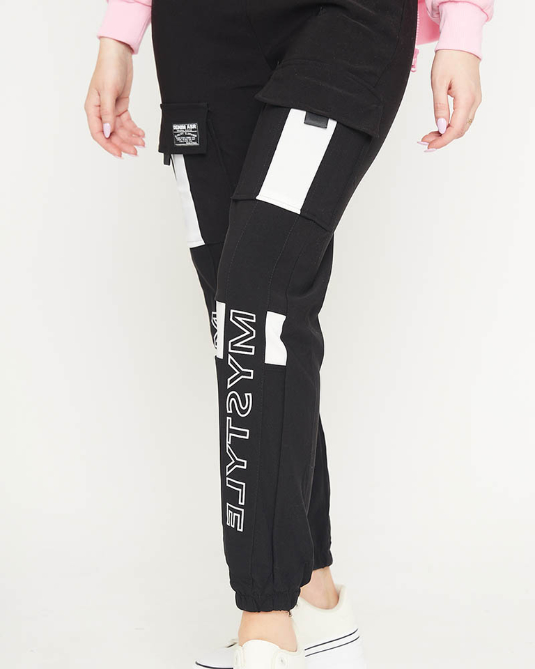 Pantaloni cargo negri de damă cu inscripții - Îmbrăcăminte