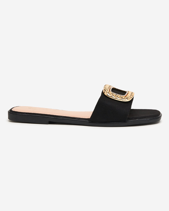 OUTLET Papuci de dama din piele intoarsa ecologica neagra cu catarama aurie Lozi. Încălţăminte