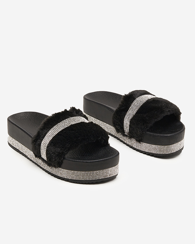 OUTLET Papuci de dama negri cu blana si zirconiu cubic Zerika - Incaltaminte