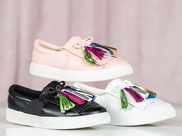 - Pantofi sport slip-on din piele ecologica. Interiorul pantofului este căptușit cu material textil. Partea superioară este decorată cu ciucuri colorați. Perfect pentru multe stiluri de zi cu zi. Notă: produsul are murdărie pe material.