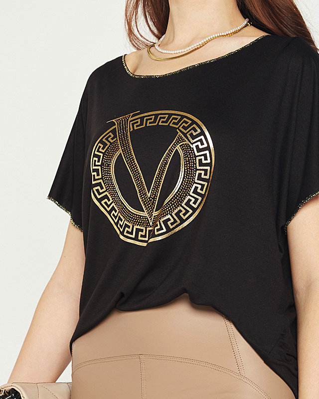 Bluză de damă neagră cu imprimeu și zirconiu cubic - Îmbrăcăminte