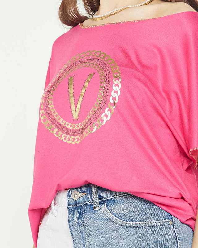 Tricou dama fucsia cu imprimeu auriu si zirconiu cubic - Imbracaminte