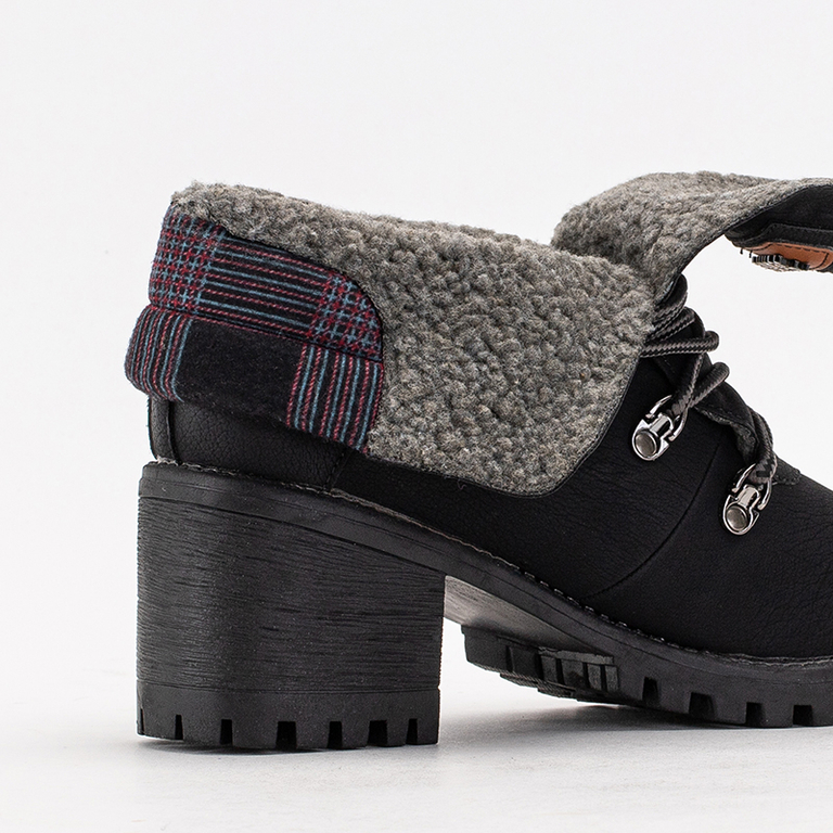• Botine de dama cu toc din cauciuc tip post, din piele ecologica. Model cu siret, captusit cu piele de oaie. Un accesoriu grozav pentru o rochie și un pulover! PANTOFI NEGRI DE IARNA CIZME IZOLATE ROYALTAN Notă: produsul are zgârieturi pe material.