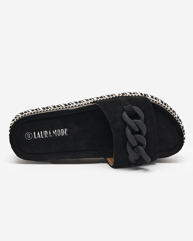 - Papuci de dama clasici pe talpa decorata, mai inalta si mai groasa din material cauciucat. Inserția este din piele de căprioară ecologică, cureaua este tot din piele de căprioară ecologică cu ornament de lanț. Super pentru o vacanta! Notă: produsul are zg