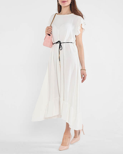 Rochie albă de damă cu volane și curea cravată în talie - Îmbrăcăminte
