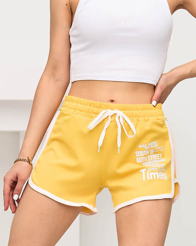 Pantaloni scurți galbeni de damă cu inscripții - Îmbrăcăminte