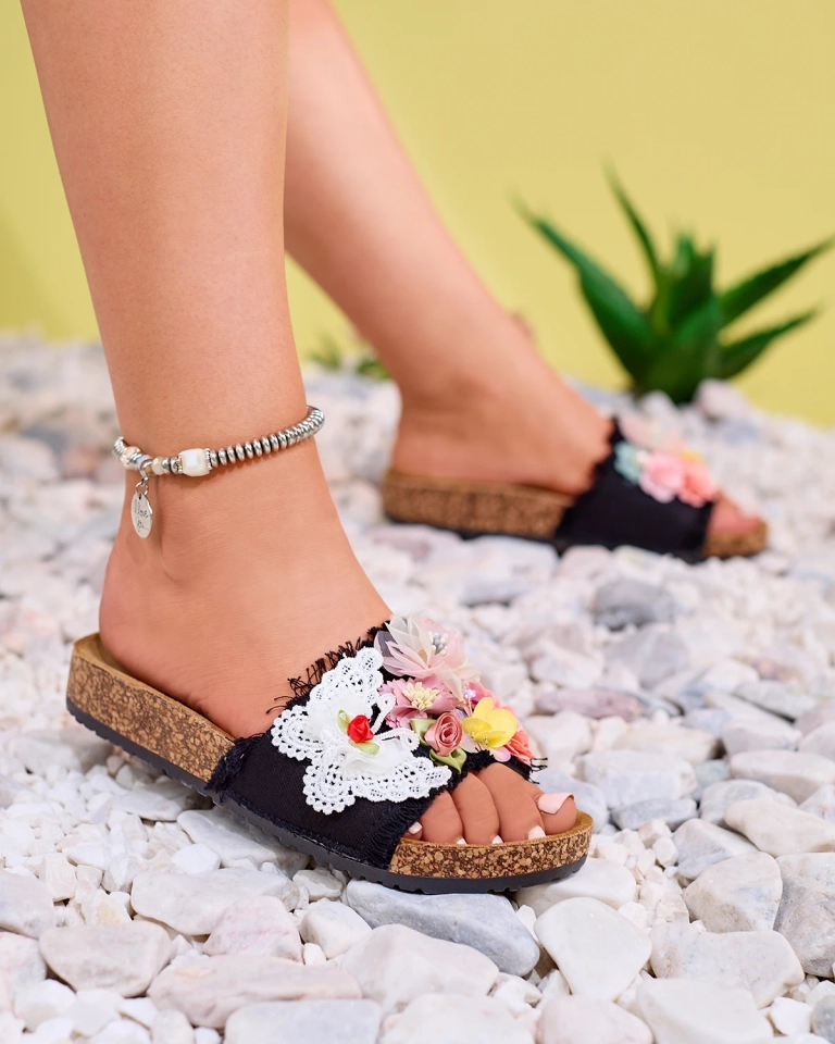 Papuci de dama cu flori din stofa in negru Ososi- Incaltaminte