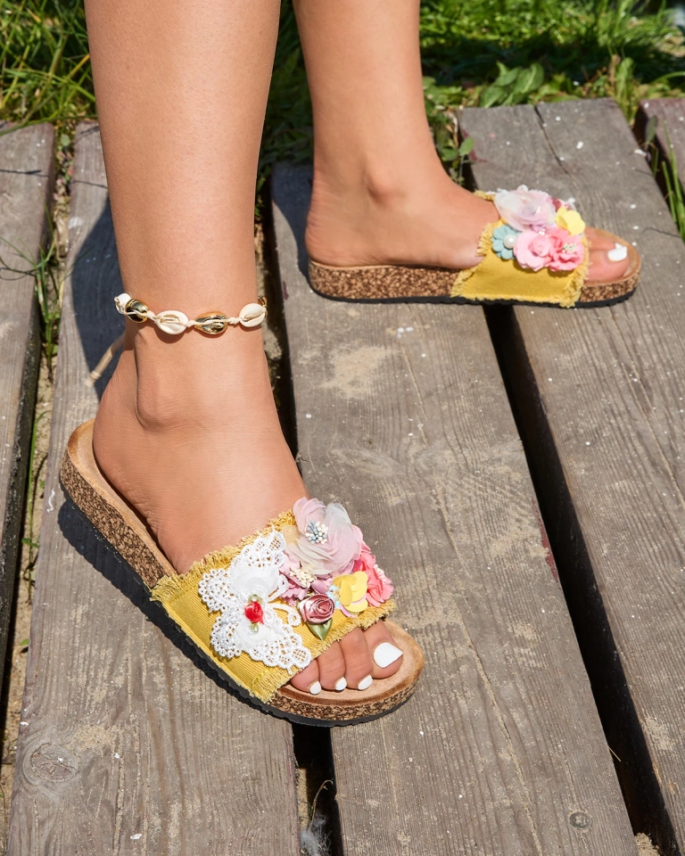 Papuci dama cu flori din stofa in galben Ososi - Incaltaminte