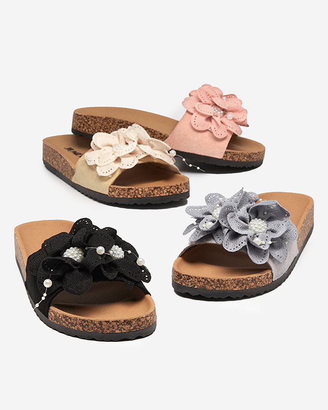 • Papuci de dama fermecatori din piele ecologica capris, decorati cu flori din stofa cu perle. Talpa este decorata cu un material tip pluta. Un plus genial la multe stiluri de vară! Notă: produsul are urme de lipici pe material.