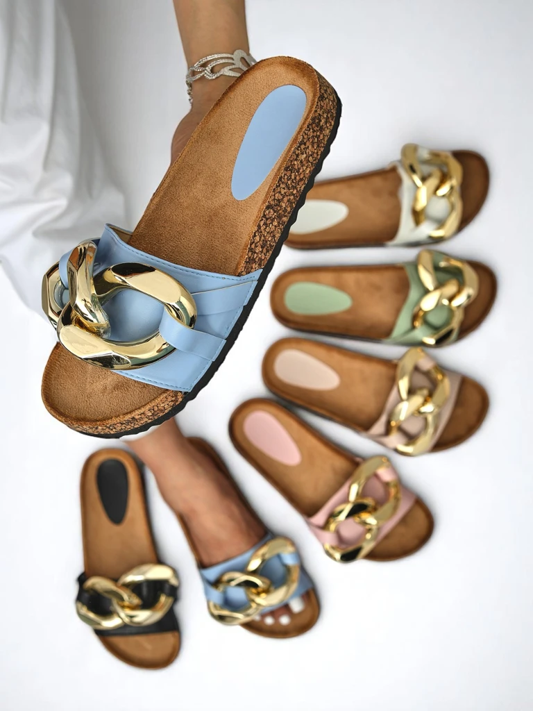 - Stylowe klapki damskie wykonane ze skóry ekologicznej, wkładka zaś z eko skóry zamszowej. Posiadają złotą ozdobę na paseczku. Model na płaskiej i gumowej podeszwie z materiału a'la korek. Świetny dodatek do wielu letnich outfitów!