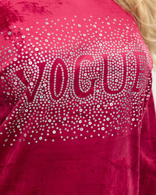 • Set trening dama din material la velour, hanorac fara inchidere este decorat cu paiete, are gluga. Pantaloni cu bandă elastică în talie și buzunare în față. NOTĂ: Precizia măsurătorii (+/-) 1 cm.