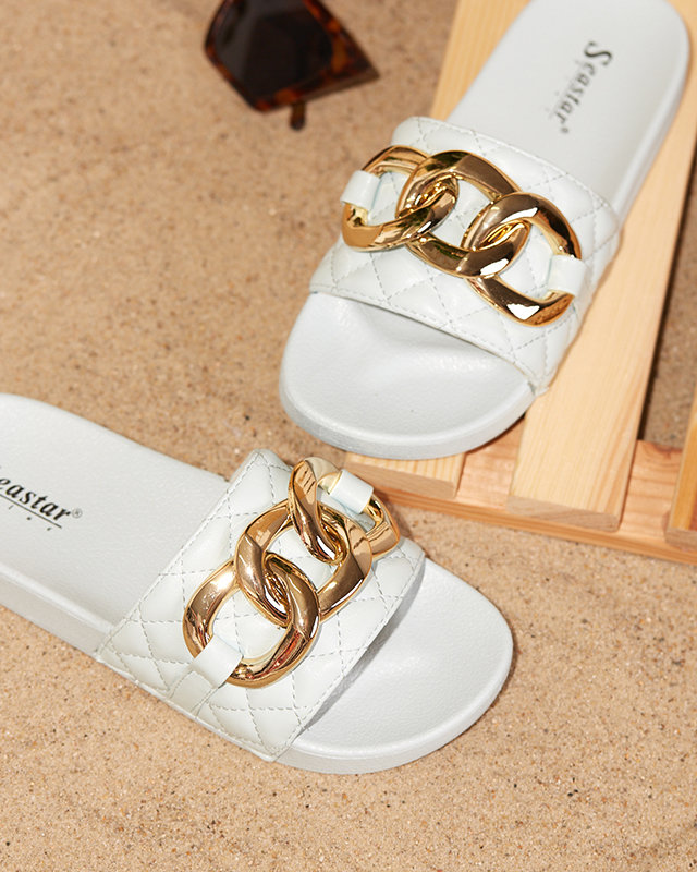 - Cei mai la modă papuci de damă din acest sezon din piele ecologică matlasată. Modelul este decorat cu un lant mare de plastic de culoare aurie. Brantul si talpa sunt din material cauciucat. Notă: produsul are urme de lipici pe material.