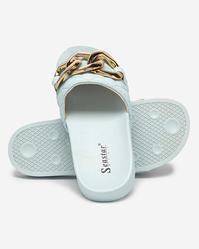 OUTLET Papuci de dama albastri matlasati cu lant auriu Eteris - Incaltaminte