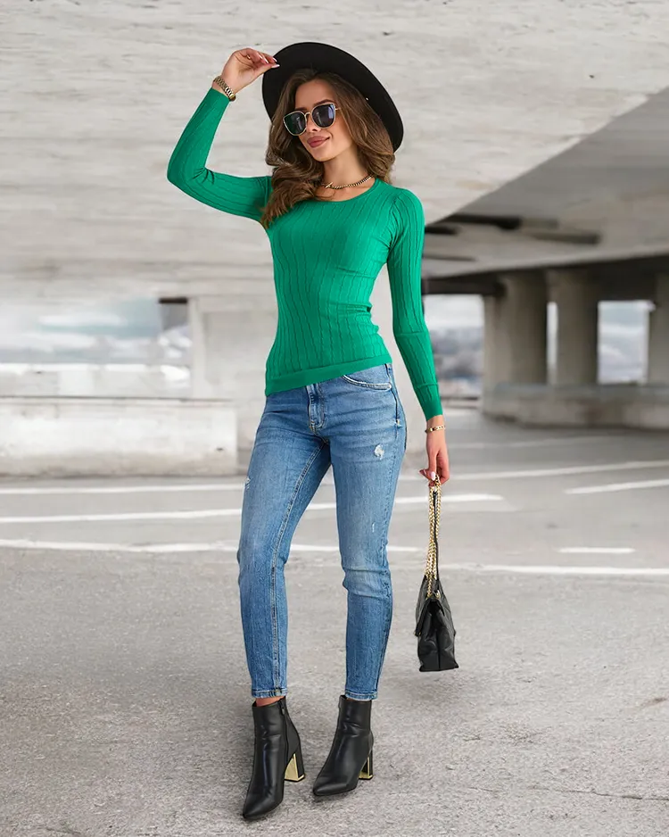 Pulover de damă verde cu gât rotund - Îmbrăcăminte