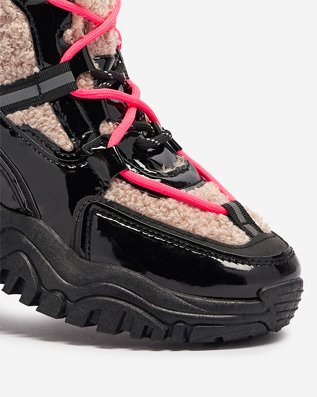 Pantofi sport de damă negri cu blană și șireturi roz neon Adbo- Footwear