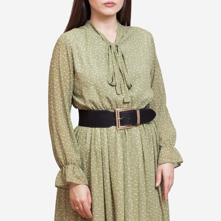 - Cureaua mega elegantă pentru femei de culoare neagră, realizată dintr-o combinație de piele ecologică și cauciuc. Modelul se încheie cu o cataramă mare aurie. Un accesoriu frumos pentru orice styling!