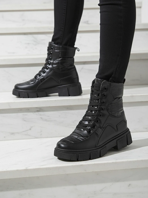 - Botine dama excelente cu șireturi, tip workeri, partea superioară este realizată dintr-o combinație de piele ecologică și material sintetic tip cerată cu finisaj matlasat. Interiorul este căptușit cu material textil. BOTINE TRAPPER QERTERA NEGRE, FĂRĂ CĂP