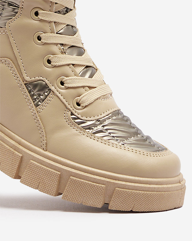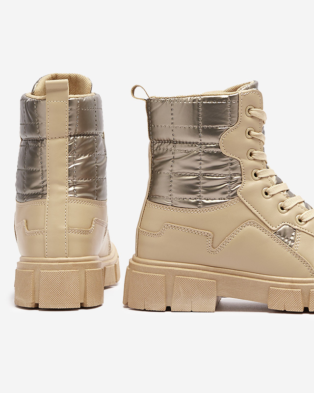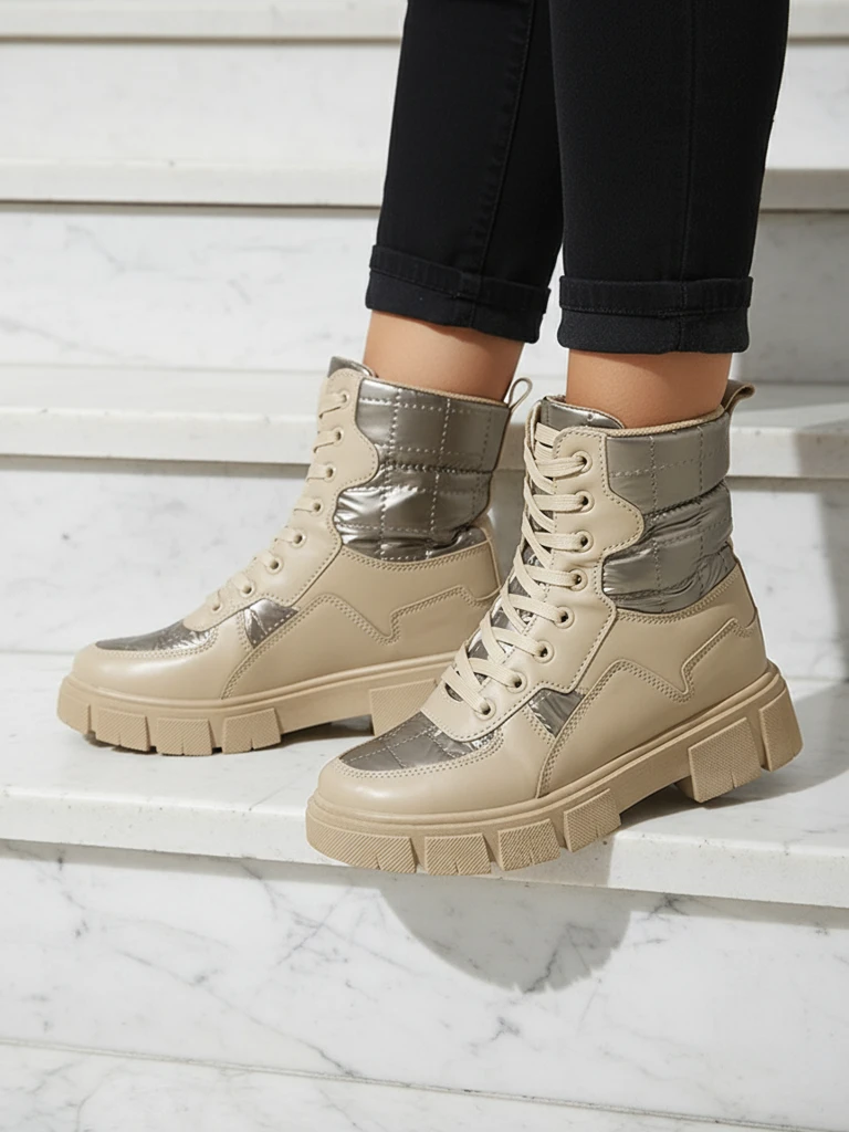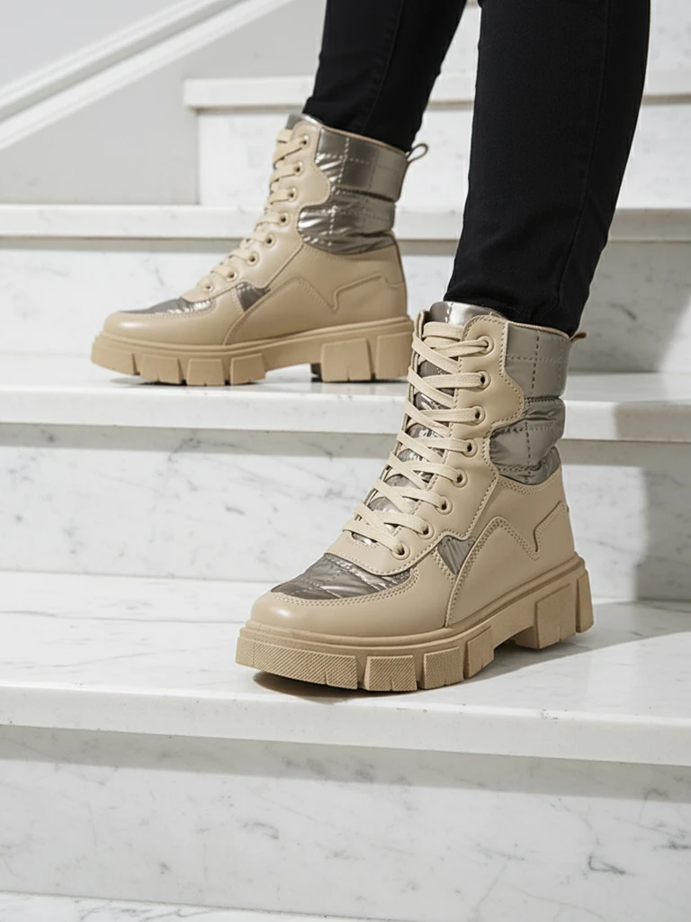 - Botine dama excelente, tip workeri, cu șireturi, partea superioară este realizată dintr-o combinație de piele ecologică și material sintetic tip cerată cu finisaj matlasat. Interiorul este căptușit cu material textil.