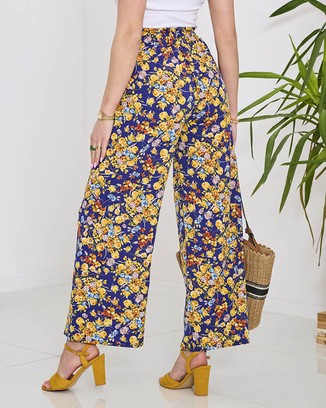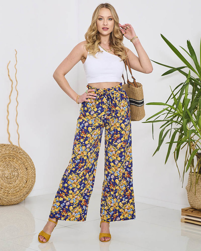 Pantaloni palazzo de damă albaștri cu flori albastru marin- Îmbrăcăminte