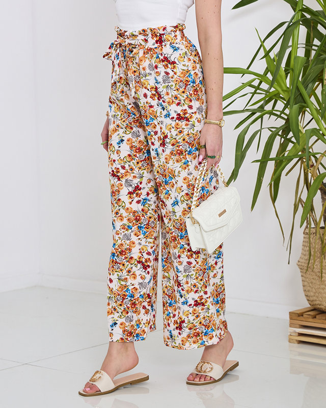 Pantaloni palazzo alb cu flori portocalii pentru femei- Îmbrăcăminte