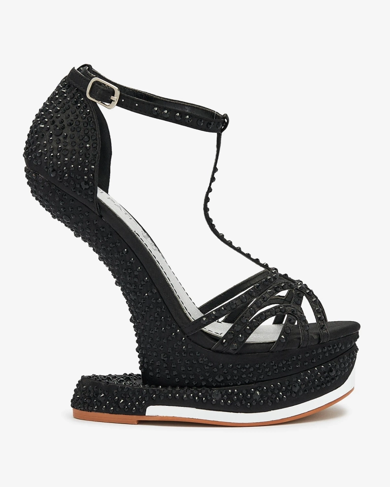 - Pantofi de damă unicat, confecționați din material textil și talpă din piele naturală. Partea superioară ajurată este decorată cu zirconii. Modelul are o platformă și un toc înalt invizibil. Încălțămintea se încheie cu o cataramă în jurul gleznei.