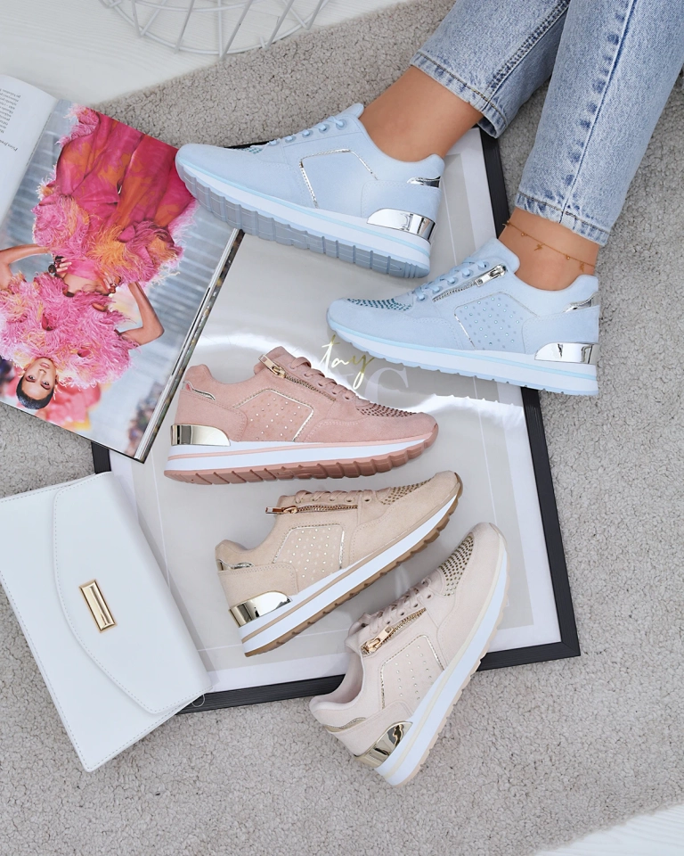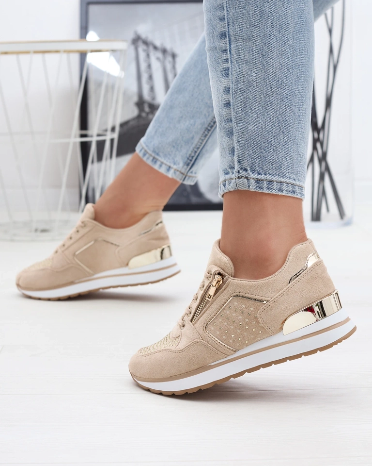- Pantofi sport eleganți de damă, confecționați din piele ecologică de căprioară, au inserții metalice. Partea superioară cu șireturi, decorată cu zirconii, fermoar decorativ pe lateral și talpă din material textil. Super accesoriu pentru blugii mamei și un