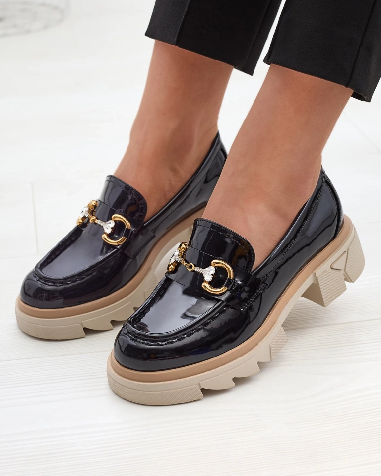 - Mocasini eleganți de damă pe talpă solidă. Model în stil casual, confecționat din piele ecologică lăcuită. Talpa este din piele naturală. Pe nas un ornament metalic cu cristale. Baza perfectă pentru look-ul de zi cu zi!