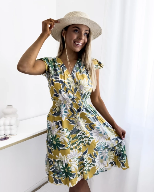 Rochie mini de damă muștar cu imprimeu floral - Îmbrăcăminte