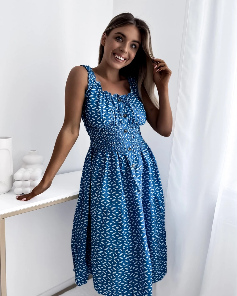 Rochie de damă până la genunchi cu imprimeu, de culoare albastră- Îmbrăcăminte
