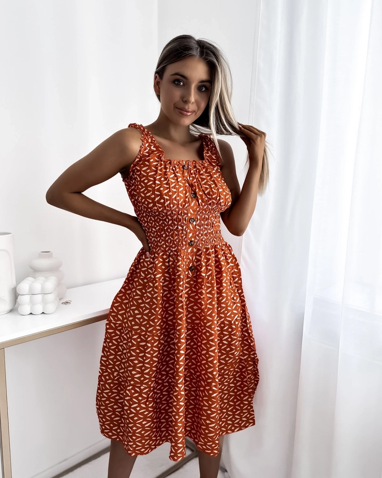 Rochie de damă lungă până la genunchi cu imprimeu în portocaliu- Îmbrăcăminte