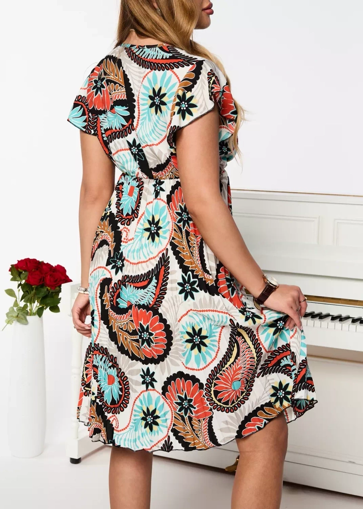 - Rochie de vară de damă până la genunchi, realizată din țesătură plisată ușoară. Model cu decolteu plic și mâneci scurte. Perfectă cu sandale! NOTĂ: Precizia măsurătorilor (+/-) 1 cm.