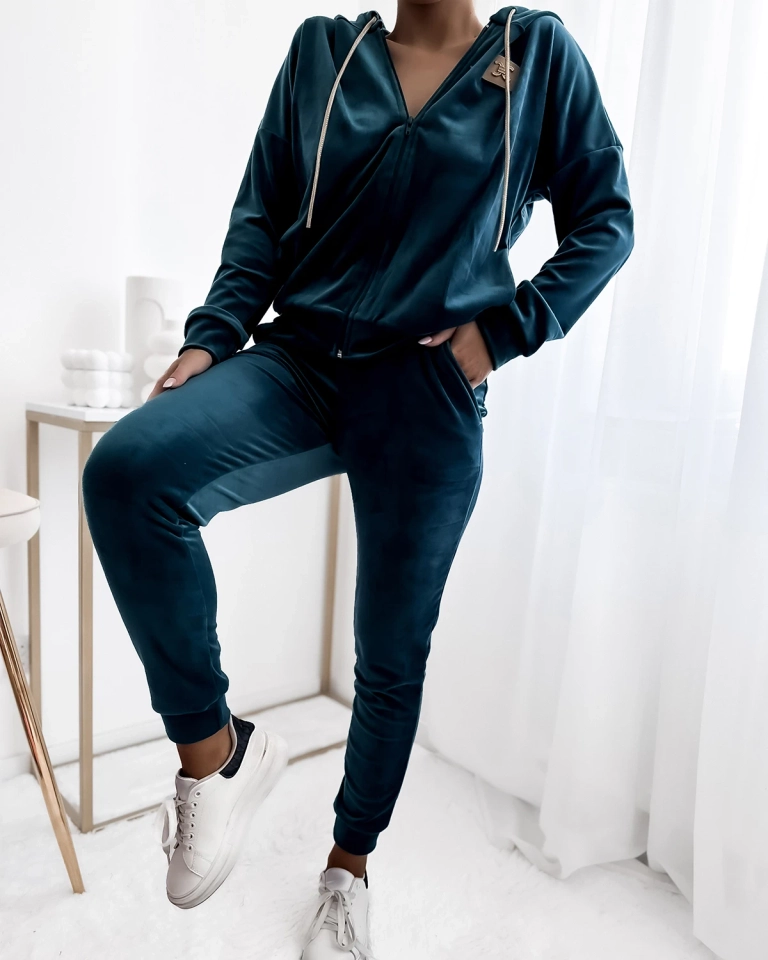 - Set de bluză pentru femei din material moale a'la velur. Hanoracul este decorat cu un plasture, are glugă, pantaloni legați și 2 buzunare. Pantaloni cu talie elastică largă și 2 buzunare glisante. NOTĂ: Precizia măsurătorilor (+/-) 1 cm.